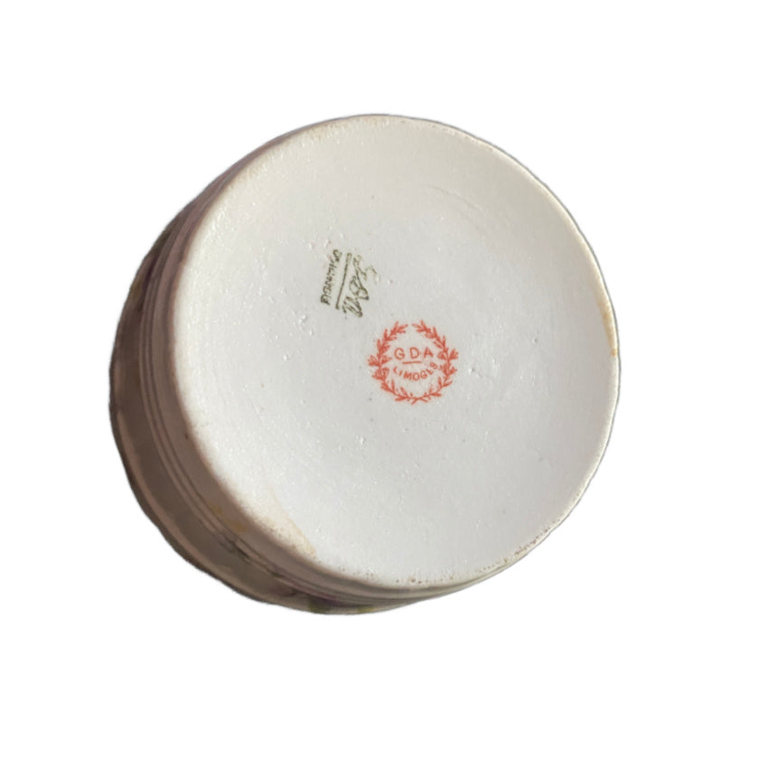 This elegant piece captures the romantic charm of turn-of-the-century France, featuring a milk bucket shape with gently scalloped edges, petite side handles, and the signature fine translucence of Limoges porcelain. The floral design, in shades of rose, blush, lavender blue and green with touches of hand painted 24kt gold give this piece its irresistible antique allure. Perfect for serving butter, condiments, or as a charming addition to your Limoges collection. A beautiful example of French artistry—romantic, refined, and timeless, you will love it for showcasing one perfect rose, too!