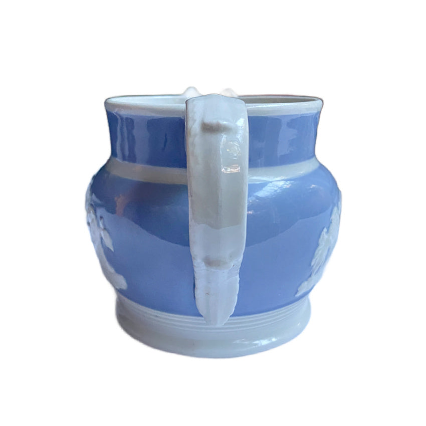This refined English Staffordshire pearlware pitcher or small cider jug was produced by Chetham & Woolley, Stoke-on-Trent, England, during the early Regency period, circa 1820–1830. Finished in a soft blue glaze and adorned with applied classical jasperware-style relief putti figures, and an ornate urn inspired by the neoclassical tradition. The petite scale gives the jug an especially charming presence.