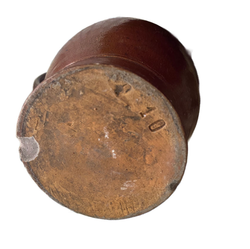 The warm earthen hue and subtle sheen of the glaze highlight the simple, utilitarian elegance of its form—rounded body, slender neck, and carefully pulled handle. Distinctive incised lines around the upper rim add a touch of artisanal detail. A fine example of traditional French pottery craftsmanship, showing the patina and imperfections that come only with time and use. Of note there are two chips on the bottom and one on the top as shown, which adds authentic patina to a useful French antique such as this.