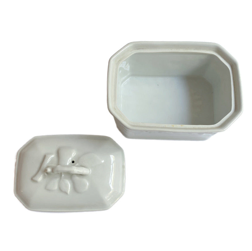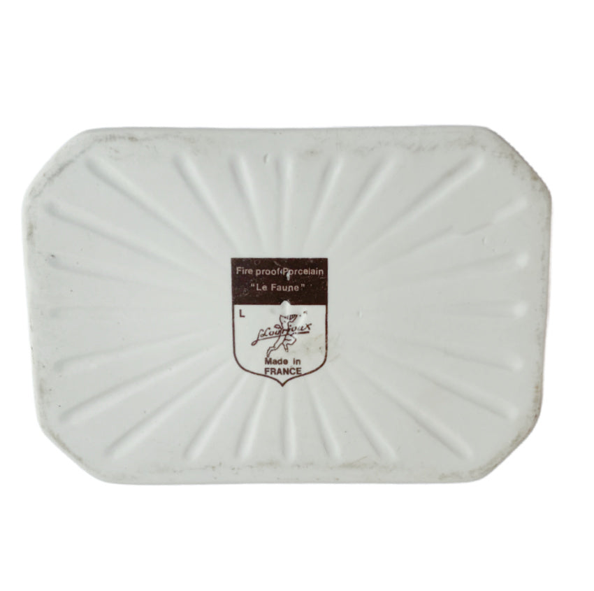 A charming small 1930's French White Porcelain Pâté Tureen with Lid, by Lourioux Le Faune, Petite Terrine Poire sur Branche, featuring delicate fruit motifs in relief along the body and lid. Its petite size makes it ideal for individual servings, sauces, or small accompaniments, while still showcasing the refined craftsmanship and luminous white glaze typical of French Art Deco blanc de blanc porcelain.