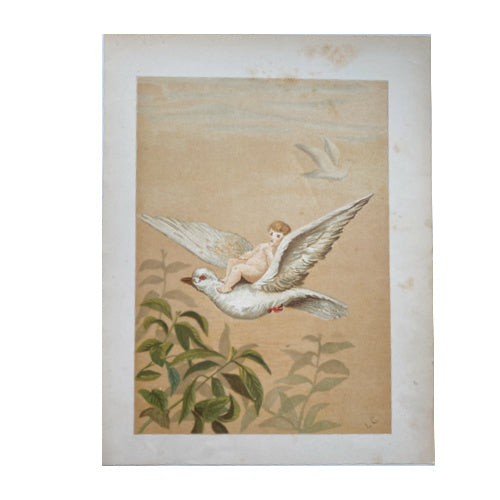 This beautifully detailed Victorian print captures her distinctive artistic voice — a delicate fairy drifting among tender foliage seated on a white dove, rendered in luminous layered color through the masterful chromolithographic process. The composition reflects the Victorian era’s reverence for childhood, nature, and imagination, expressed with grace and refinement. Printed using the refined chromolithographic process, the image retains its beautiful layered color and delicate tonal variations.