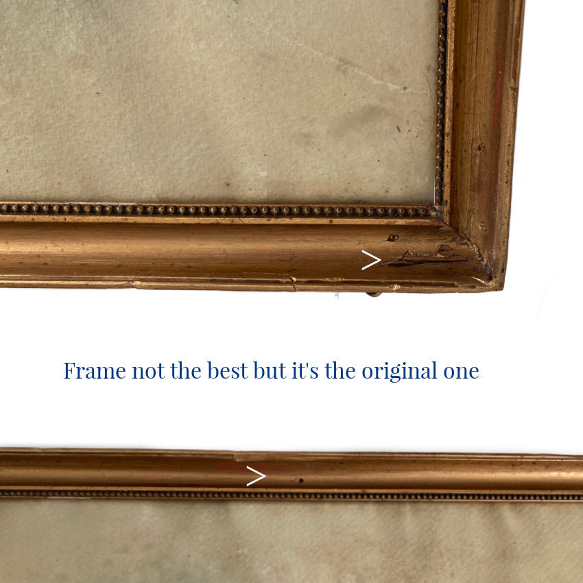 The painting is in its original gilt wood frame, which has been restored, preserving its elegant profile and period character. A very small corner loss to the glass is present and does not detract from the overall presentation when displayed. We have papered the back to preserve this lovely antique work of art. The elongated composition makes this painting especially versatile—beautiful above a console, layered within a salon-style wall, or placed in a bedroom or dressing area where its romantic palette can be fully appreciated. A refined and soulful French work, valued not for perfection, but for its authenticity, atmosphere, and gentle passage of time.