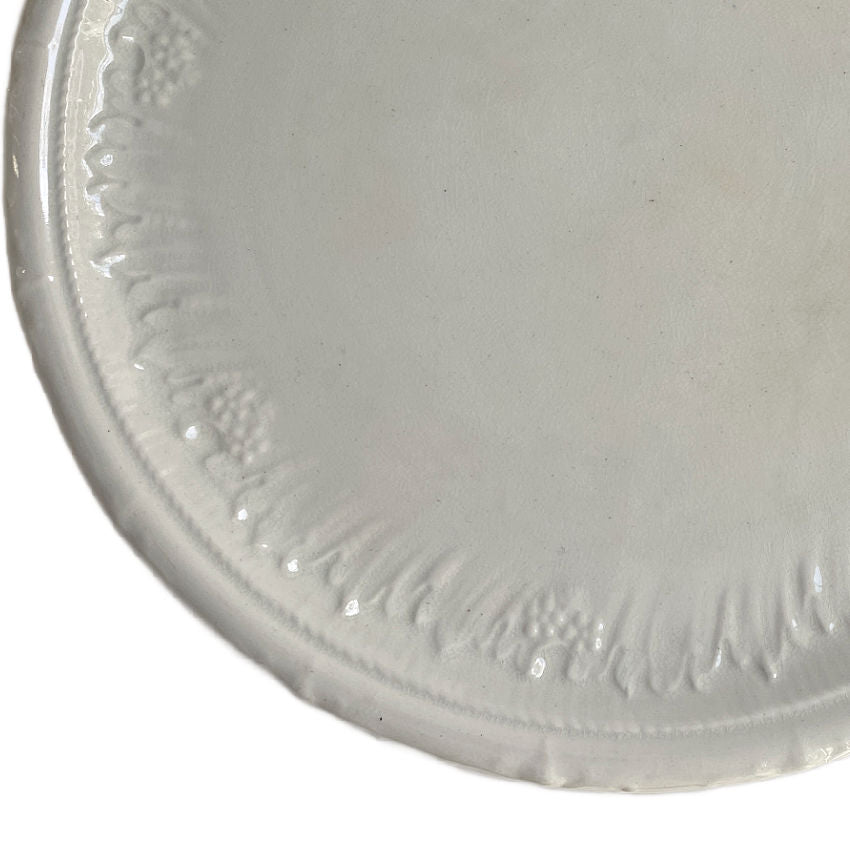 A rare and elegant Antique French Ironstone Large Shop Display Cheese Plateau, once used in an épicerie or fromagerie to present fine cheeses with understated French charm. Made of heavy white ironstone with a raised fleur-de-lis border, this impressive piece has the soft aged patina only time and use can create.