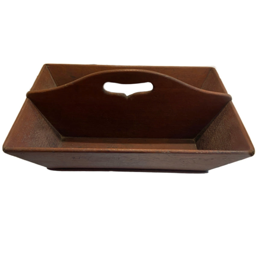 A charming 19th century country kitchen work box, hand-crafted in rich, warm patinated wood. A wonderful example of estate-made early 1800's craftsmanship with enduring appeal, with finely executed dovetail joinery at the corners. This utilitarian yet decorative work box or tote would have been an indispensable part of a lady’s household, used for carrying and storing kitchen essentials, sewing, or small domestic tasks. The deep, sloped sides and central handle with a cut-out heart detail reflect both practicality and feminine charm, while the timeworn surface tells the story of generations of use.