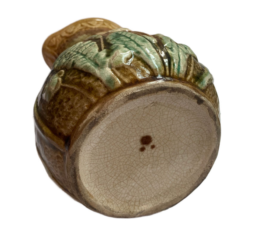 Inside, the rose-pink glaze adds a touch of unexpected charm, while the architectural handle and gentle craquelure reveal the artistry of age. A rare and lyrical example of fine French majolica to treasure and display. Lovely antique condition, the very rim has age appropriate wear, its softly aged surface tells the story of time and use, adding warmth and soul to this exquisite example of 19th-century majolica.