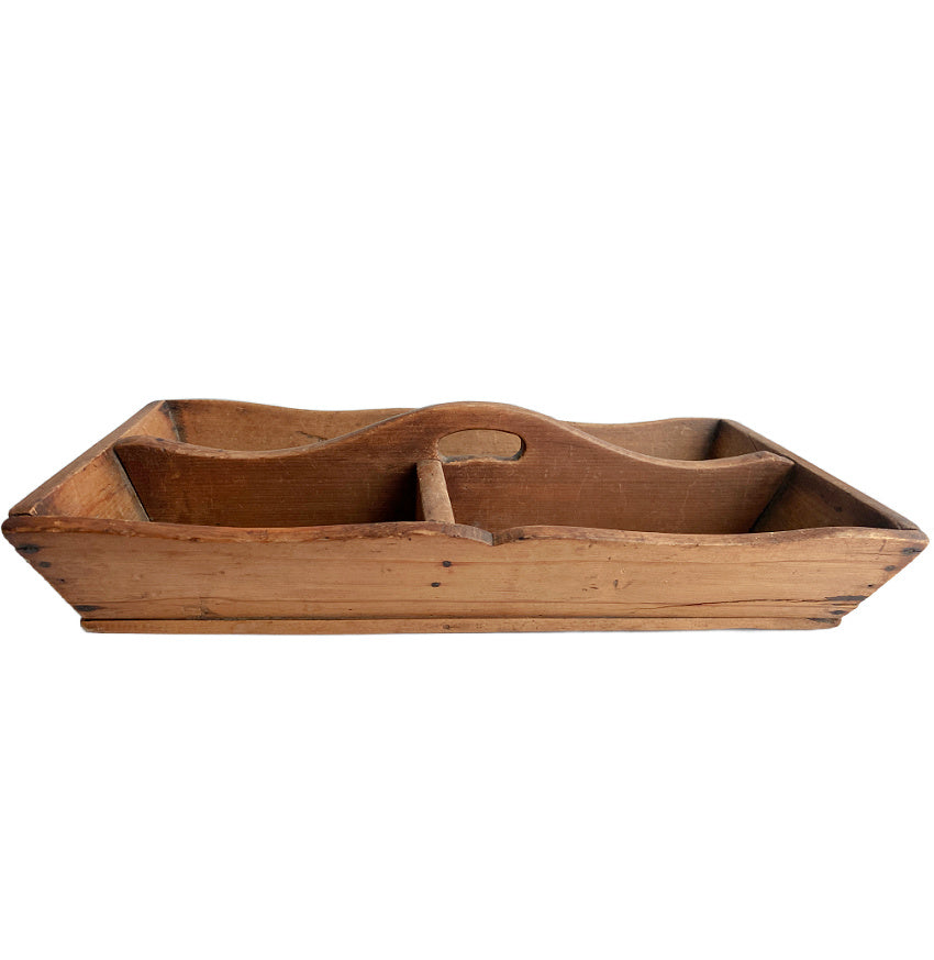 A delightful Antique Country Kitchen Work Box, made of aged wood with gracefully scalloped sides and a center carrying handle. This one is rare due to its very long size, it measures 16-1/4" long. Once used by a lady or housemaid in a country home to hold sewing, mending, or kitchen tools, this charming piece reflects the beauty of simple, well-made things. Made by someone for his lady love, this utilitarian yet decorative work box or tote would have been an indispensable part of a lady’s household, used for carrying and storing kitchen essentials, sewing, or small domestic tasks. Hand-crafted with graceful scalloped sides and a central cut-out handle, this tray bears the wear earned from generations of use, one side has a split as shown.