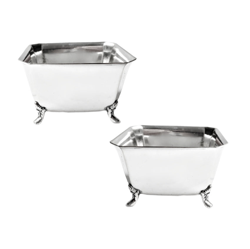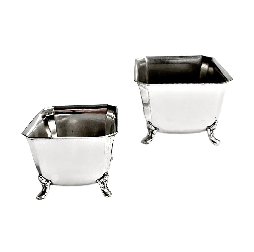 A lovely Pair of Antique Silverplate Footed Mint Bowls, beautifully crafted in a refined late Victorian style. Each bowl features a distinctive rectangular, gently flared form resting on four finely cast decorative feet—an elegant silhouette typical of quality 19th-century American or English silverplate workshops. These early ones were later copied by many silver makers including Meriden, with different variations of the elegant little feet, and sold as nut bowls when serving nuts to guests was all the trend.