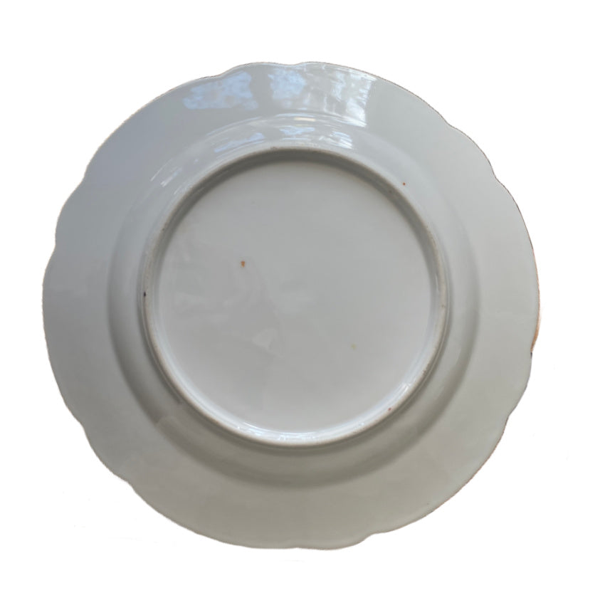 The decoration was lovingly hand painted, with raised white enamel accents and 24 kt gilding that catch the light softly, giving each plate a luxurious glow. Each plate is finished with a gently scalloped rim edged in hand-applied gilding, adding a quiet note of old-world luxury. The gilt rims have aging as is to be expected of antique porcelain that was used and loved, as shown. Measuring a traditional 9½ inches—what would have been considered a classic dinner plate size—these plates are wonderfully versatile, ideal for luncheon, supper, or layered table settings.