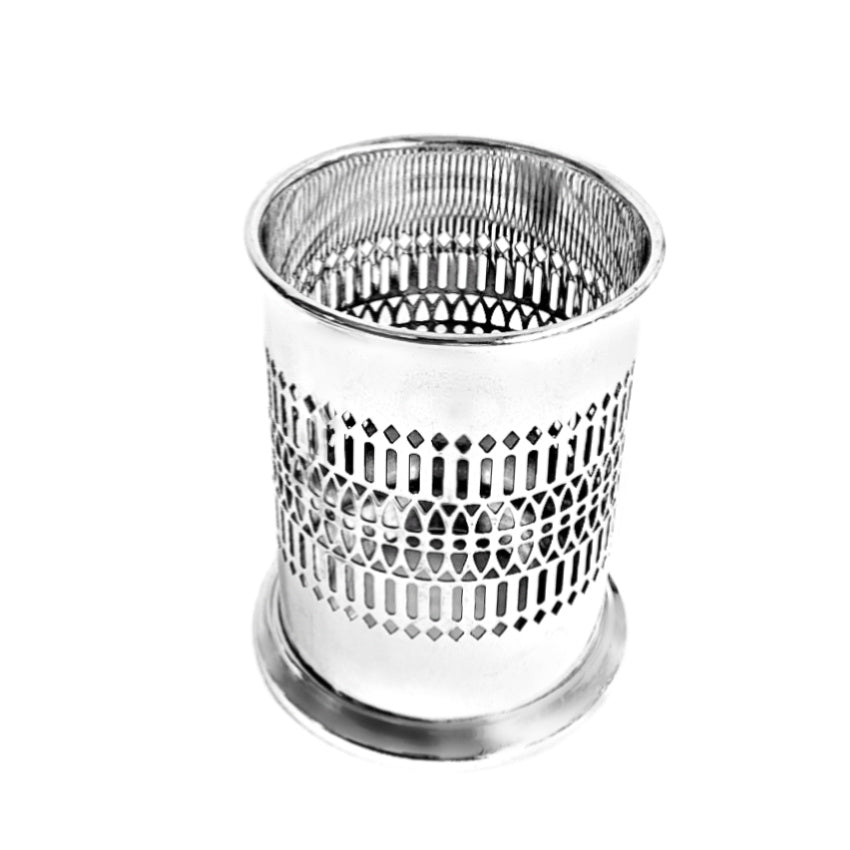 A refined silver-plated wine bottle coaster from the 1930's, featuring delicately reticulated sides and elegant proportions. Made by the Sheffield Silver Company, which began making silver in 1908, and later became part of Reed & Barton. Its Art Deco design, with clean lines and subtle geometric detailing, elevates this functional piece into a decorative treasure.