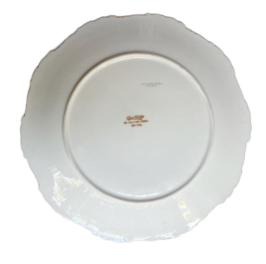 A truly stunning 19th century Copeland dessert plate, exquisitely hand painted and hand enameled with a lush bouquet of roses in romantic hues. The rim is richly encrusted with hand-applied gold in a scrolling rococo pattern that beautifully frames the floral center. So fabulous, the rim is lavishly encrusted with raised gilding in an ornate rococo design, shimmering with opulence. Each plate from this period was painted by a skilled artist, making it a miniature work of art, the most ornate, gilt encrusted museum quality hand painted plate. Made by Copeland, England, especially for Gilman Collamore & Co. - a very high-end luxury shop rivaling Tiffany & Co. and Black, Starr & Frost - in 1890.