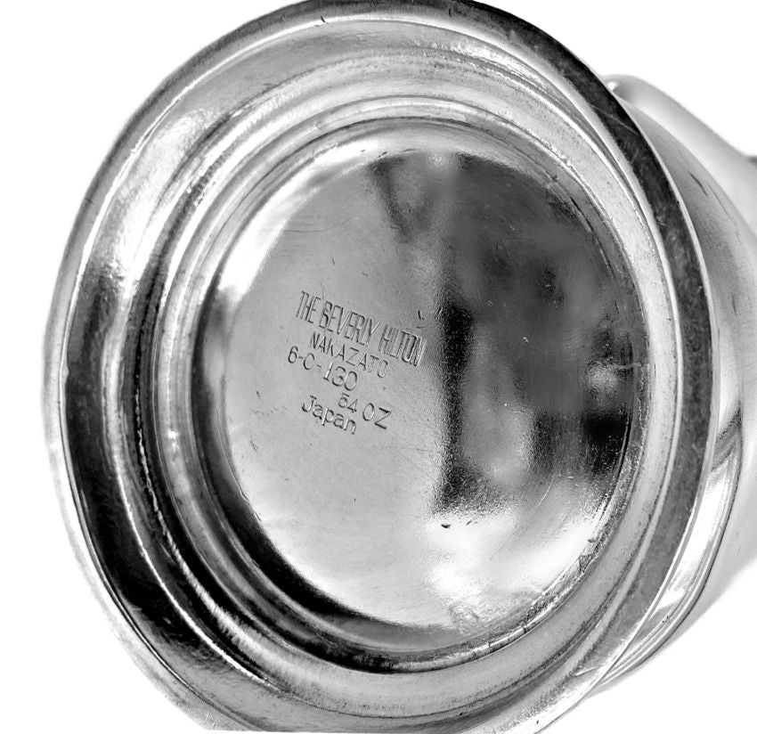 One side is engraved with the Hilton sunburst emblem. Reflecting the post-WWII practice of sourcing heavy silver-plated service-ware internationally for U.S. luxury hotels, this was made for International Silver in Japan. The company began producing hotel silverware in collaboration with Nakazato, Japan, for the Hilton Hotel chain in the mid-20th century. The underside is stamped with the hotel inventory code 6-C-130 along with the manufacturer Nakazato, Japan. These marks tie the piece directly to the Beverly Hilton’s mid-century dining program. Perfect for collectors of hotel silver, mid-century tableware, or anyone looking to add a historic touch of Beverly Hills sophistication to their home.