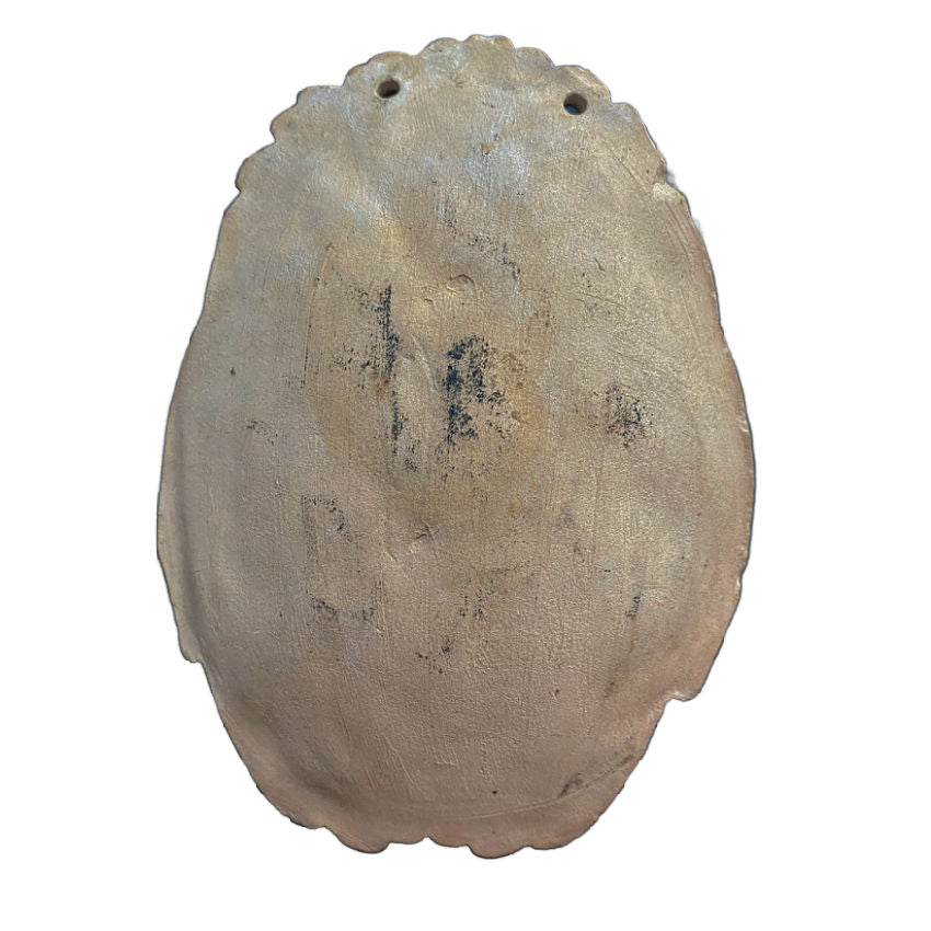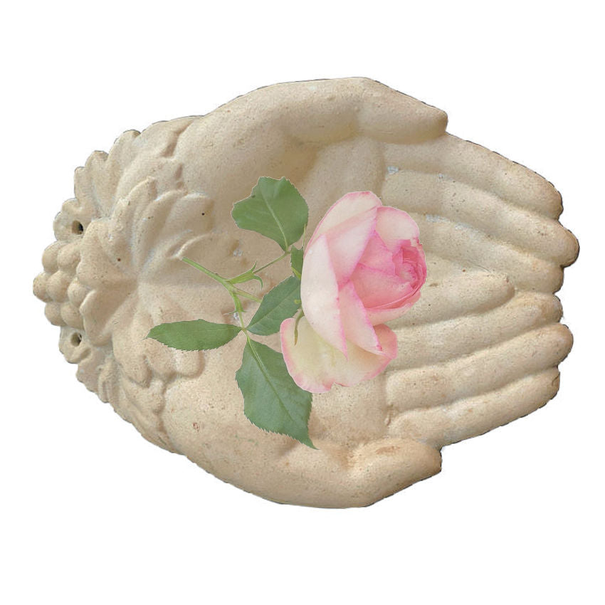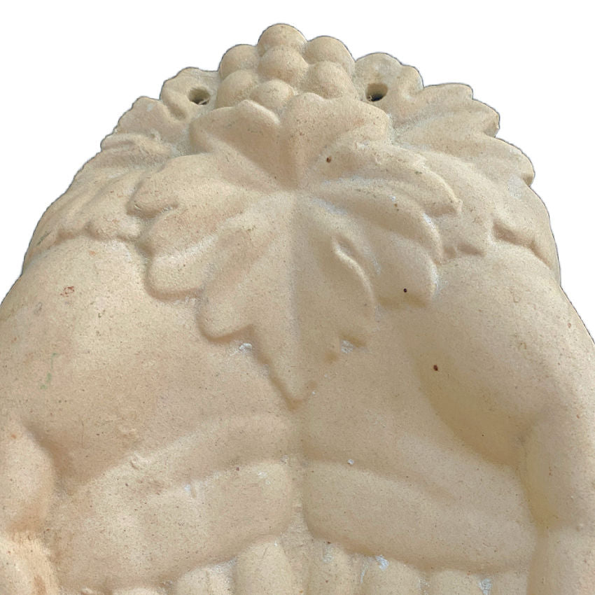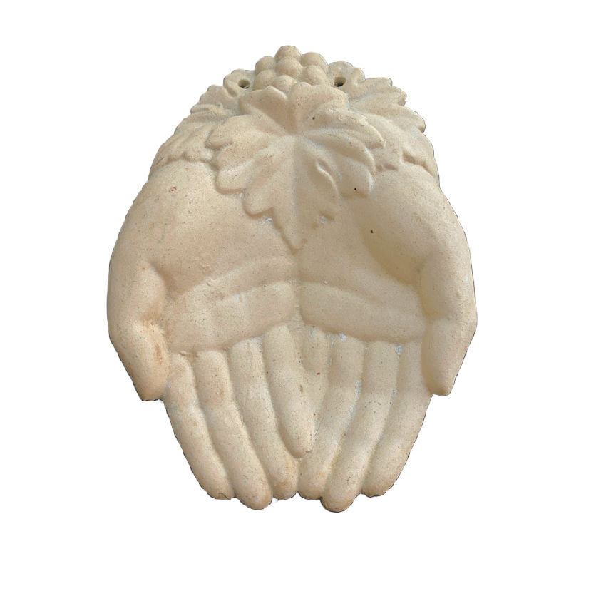 The dish features a beautifully rendered pair of hands with grapes and leaves at the wrists, there are two holes for adding a ribbon on the top and forming a decorative bow. A sweet sentimental piece, perfect to display an antique calling card, a bird's nest, a special antique locket or pin.