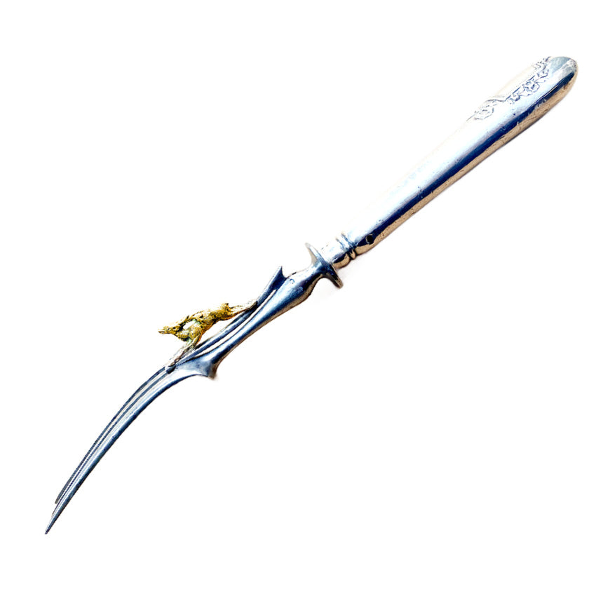 A striking and rare example of 19th-century French silver craftsmanship, this antique sterling silver meat serving fork is as functional as it is artistic. The two-tined fork features a dramatic, slightly curved design that adds elegance to any formal dining setting. The standout detail is the exquisitely rendered gilded stag in motion—delicately poised atop the fork's neck—adding a unique touch of naturalistic charm and luxury.